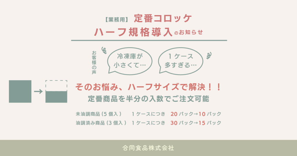 といったお客様のお悩みに合わせて現行商品の半分の入数でご発注いただけます。
